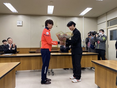 2026ミラノ・コルティナ冬期オリンピック・スピードスケート男子500mに日本代表として出場した 森重 航(もりしげ わたる) 氏(平成30年度 本校卒業)が、3月13日に表敬訪問されました。開会式では日本選手団の旗手を務め、北京五輪に続いて2大会連続の出場となりました。